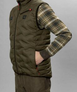 Den elektroniska värmefunktionen anpassas till vädret, jägarens aktivitetsnivå och bärarens anpassade värmeinställning. Allt styrs av clim8®-appen som du bara behöver ställa in och glömma. Appen behövs bara under installationsprocessen, när produkten har parats ihop överförs din personliga profil till jackan och dina anpassade inställningar tillämpas. Appen kan också användas för att finjustera temperaturen om du vill ställa in en specifik temperatur. Västen är isolerad med dun och är vindavvisande. Den har ett reflekterande foder som håller kvar den genererade värmen och leder värmen tillbaka mot din torso. clim8®-västen drivs av en USB-kabel som ansluts till en powerbank. Västen är utrustad med en förvaringsficka för din powerbank. Powerbanken ingår inte i leveransen. Vi rekommenderar att du använder en powerbank på minst 10 000 mAh och att den har en utgång på 5V/2,1A.