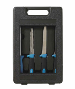 Här har du allt du behöver för att rensa din fångst! Oavsett fisken storlek, har du tre knivar för alla situationer. Knivarnas stål är enkla att slipa, och det medföljande slipverktyget gör dem vassa på några sekunder. Skärbräda ingår också.