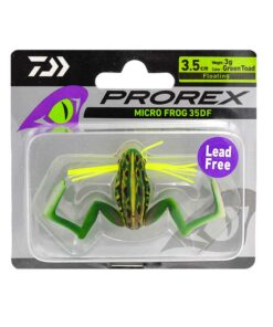 Daiwa/Prorex Micro Frog är endast 3,5 cm och har utformats speciellt för fiske efter abborre. Tack vare den flytande designen kan Micro Frog presenteras på ytan med korta slag och rör sig exakt som en riktig liten groda. Dessutom passar den perfekt för användning vid dropshotfiske. Duckfin-fötterna skapar ett naturligt rörelsemönster och spröten under hakan simulerar främre ben och rör sig naturligt och pulserar attraktivt för fisken.